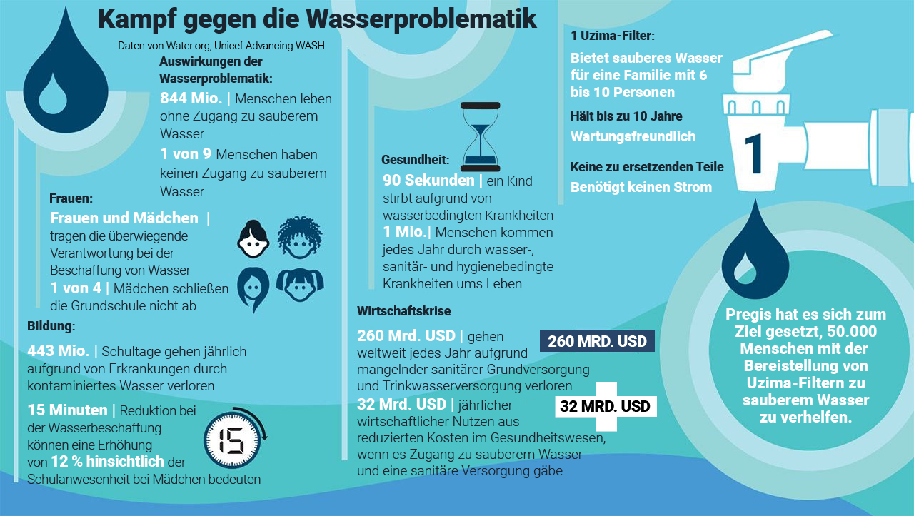 Probleme bei der Trinkwassersicherung betreffen 1 von 9 Menschen auf der ganzen Welt! Die erster Linie wirken sie sich auf die Gesundheit aus, da durch Wasser übertragene Krankheiten eine der Haupttodesursachen in den Entwicklungsländern darstellen. Dies ist ein Problem, das gelöst werden KANN und daran arbeitet Pregis.